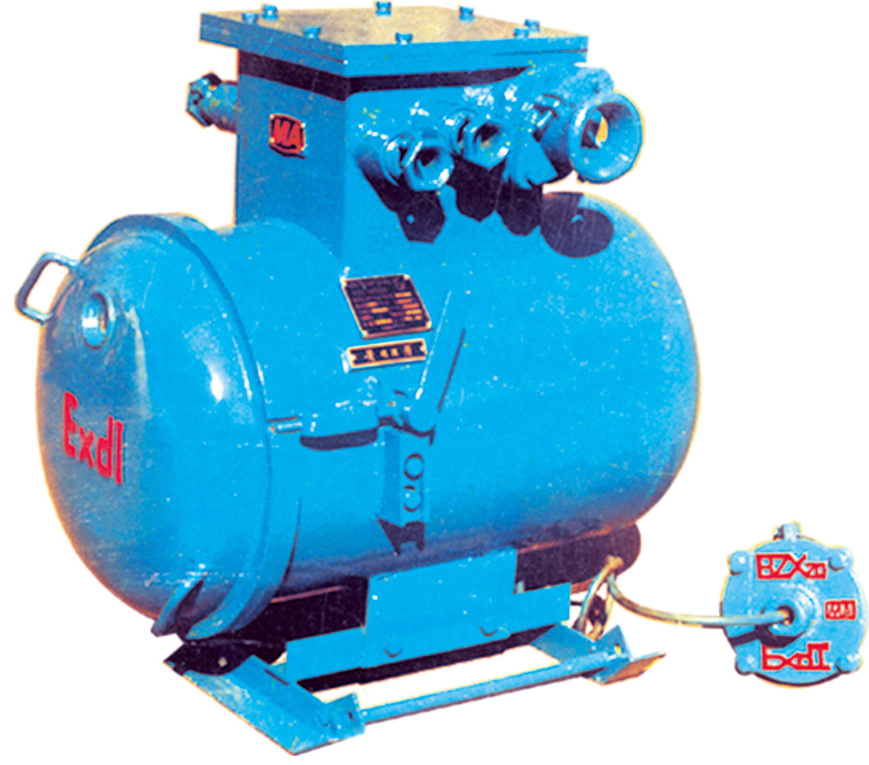 本綜合裝置主要由隔爆外殼、干式變壓器、機(jī)芯三部分組成。隔爆外殼為圓筒型,具有凸出的底和蓋,殼蓋與殼身采用轉(zhuǎn)蓋止口結(jié)構(gòu), 開(kāi)啟方便。外殼上部有一接線箱作為引進(jìn)和引出的電纜用.外殼右側(cè)裝有操作隔離開(kāi)關(guān)的手柄和檢查短路、漏電保護(hù)的試驗(yàn)按鈕,并有可靠的機(jī)械聯(lián)鎖裝置,殼蓋上方有觀察窗,可以從外面觀察指示燈狀態(tài)。機(jī)芯主要由控制變壓器、交流接觸器、直流繼電器以及電子插件等組成。干式變壓器與機(jī)芯的聯(lián)結(jié)采用端子板,檢修時(shí)機(jī)芯可獨(dú)立拿出。