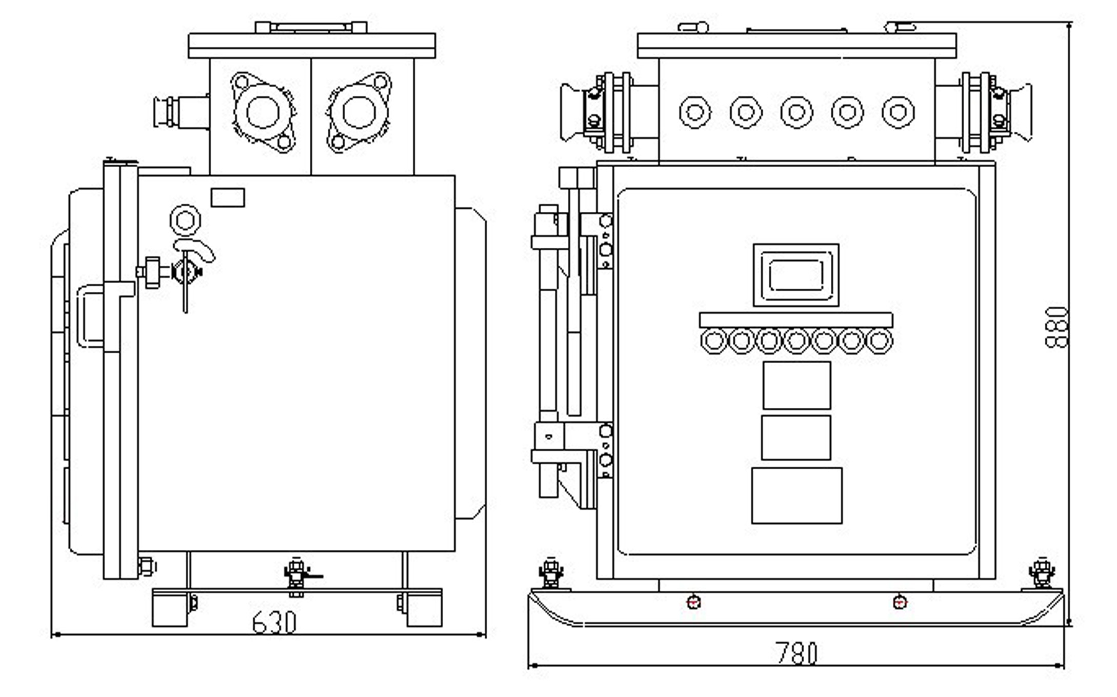 綜合裝置由隔爆外殼、主變壓器和控制部分等組成。隔爆外殼為方形,殼蓋與殼身采用滑動止口結構,開啟方便。外殼上部的接線箱作為引進和引出電纜用,外殼右側裝有操作組合開關的手柄,并有可靠的機械聯鎖裝置,門蓋上裝有控制按鈕和試驗按鈕,門蓋上有一觀察窗,可以從外面觀察到裝置里面液晶漢顯顯示屏的指示狀態(tài)。殼體內的控制部分由控制器件板和真空交流接觸器板組成。在控制器件板上裝有微電腦控制器、液晶顯示屏、電流取樣板、電流傳感器、濾波器、電源控制變壓器、試驗電阻、保險等器件。真空交流接觸器板上裝有真空交流接觸器、管式熔斷器,電流互感器,三相電抗器等器件?刂破骷迮c真空交流接觸器板通過一組航空插件及連線構成聯系。防爆外殼箱體內裝有主變壓器。